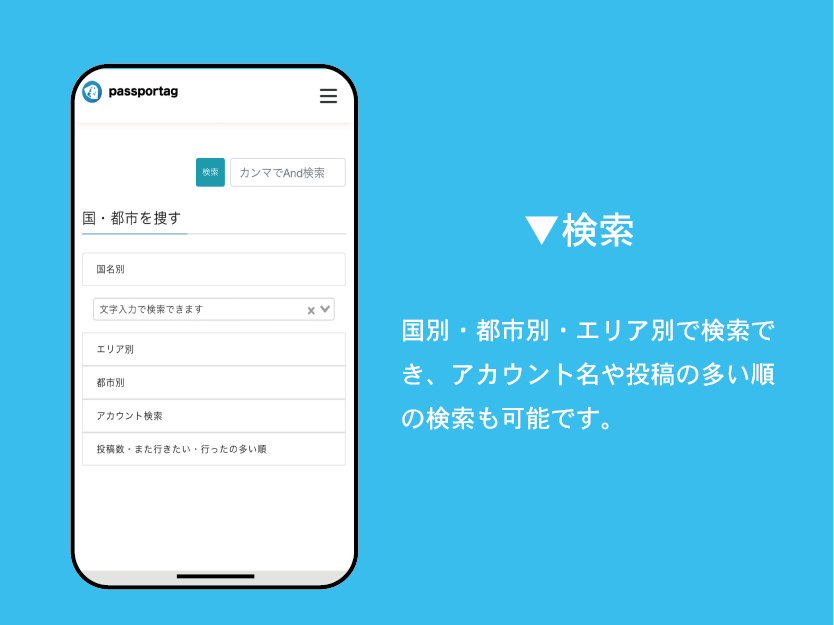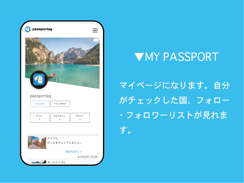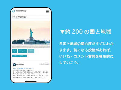 あなたの海外旅行の体験や経験を投稿し共有するのがメインのサービスです。各国の行きたい・また行きたい人の数がわかるため、その国の関心度が一目でわかります。また海外旅行での体験や経験、情報を共有することによって、これから旅行に行く人の不安を解消し、より良い旅行の手助けにもなります。